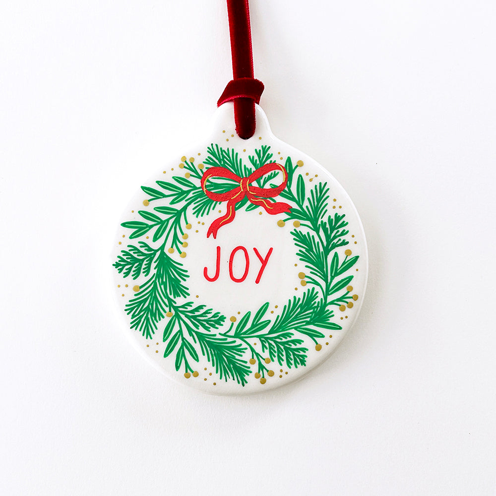 Circle Ornament - Joy Wreath - Red Velvet Ribbon