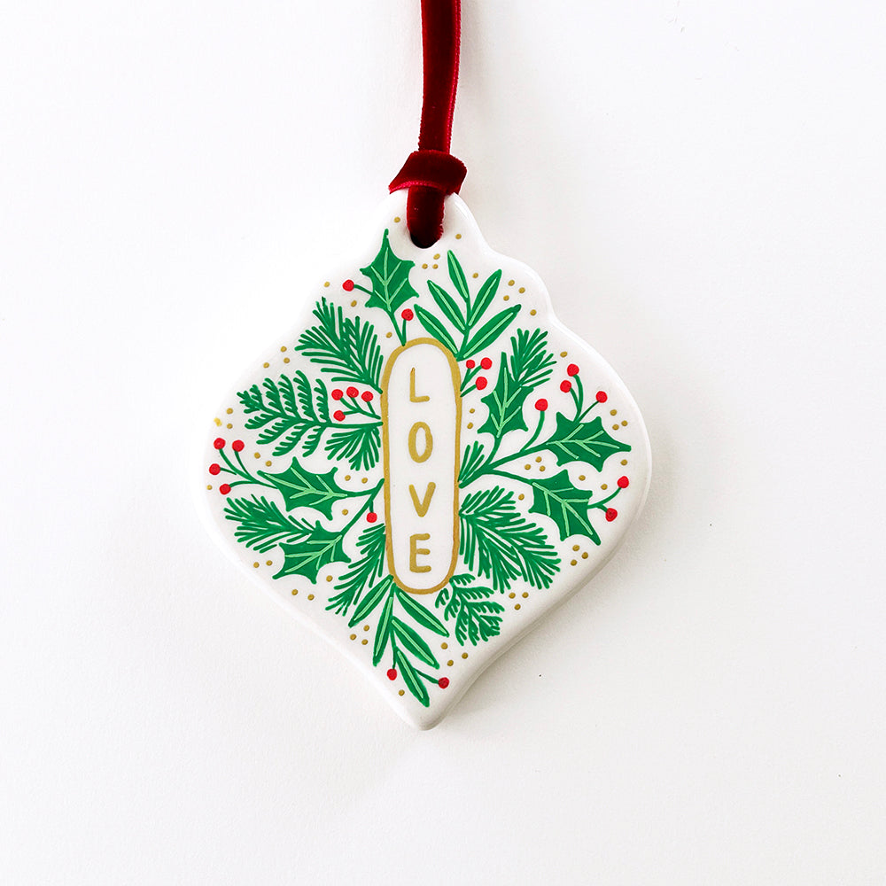 This hand-painted ornament is one of a kind, hand painted and finished with a luxe velvet ribbon, ready for hanging on your tree. Ceramic base.