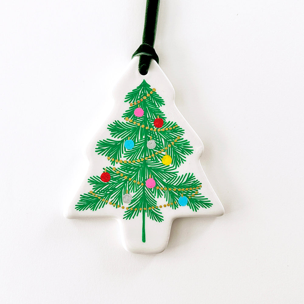 This hand-painted ornament is one of a kind, hand painted and finished with a luxe velvet ribbon, ready for hanging on your tree. Ceramic base.