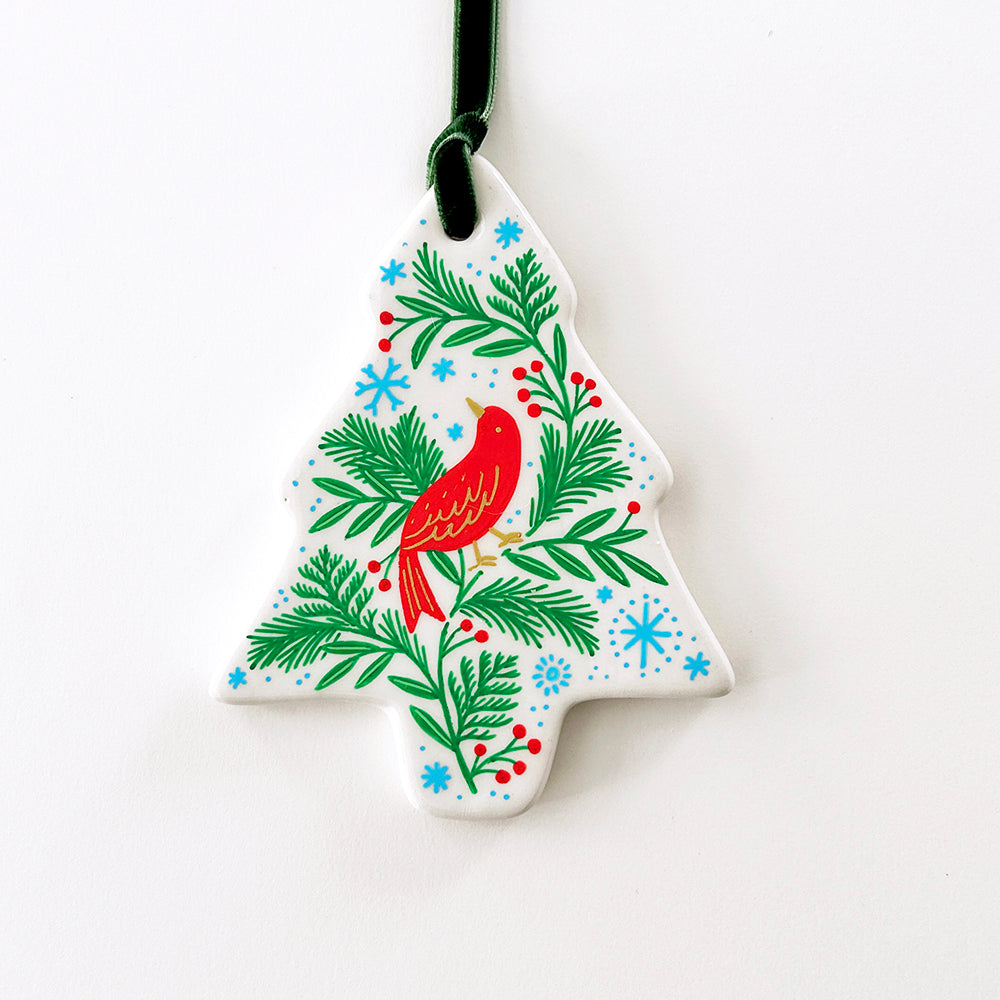 Tree Ornament - Red Bird - Green Velvet Ribbon