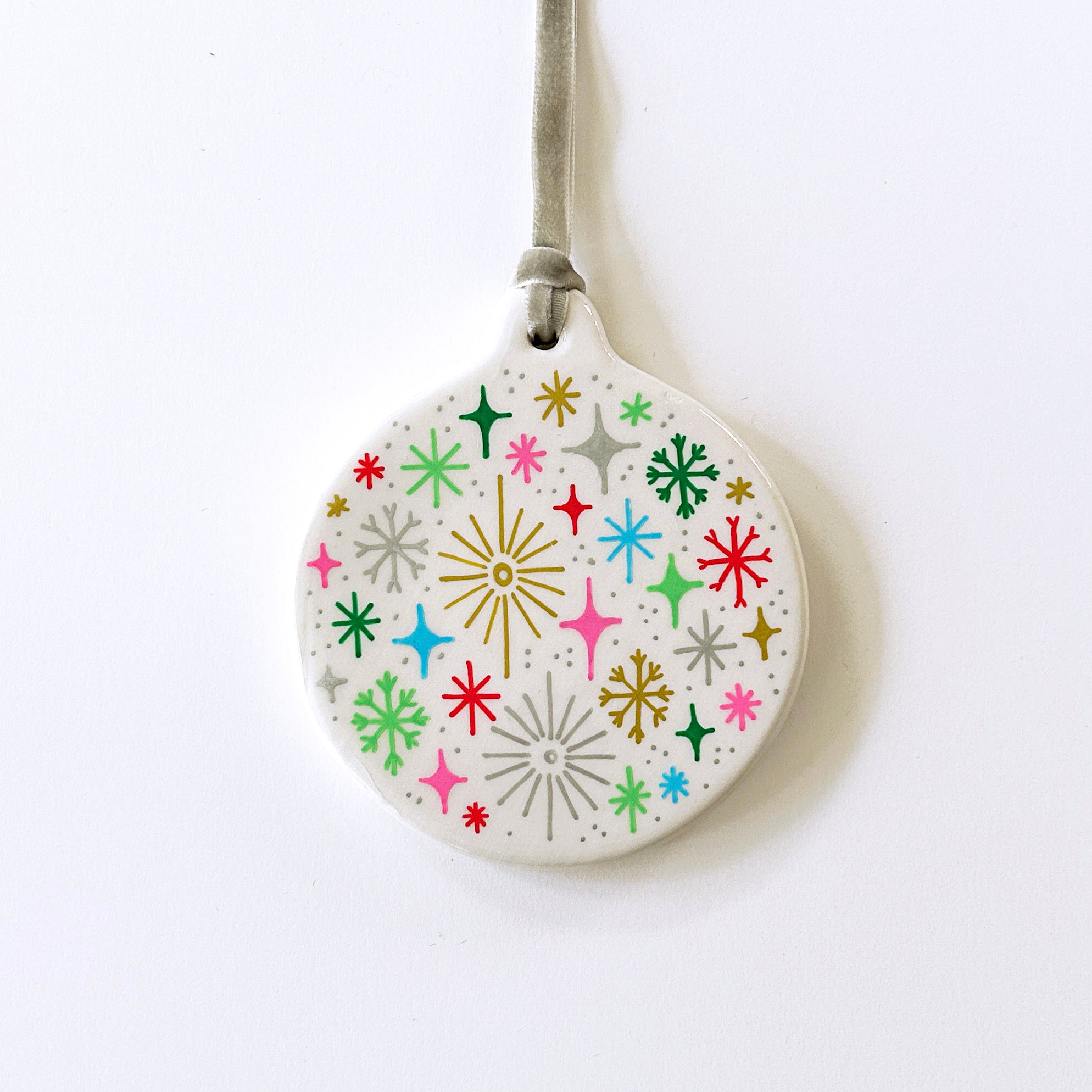 This hand-painted ornament is one of a kind, hand painted and finished with a luxe velvet ribbon, ready for hanging on your tree. Ceramic base.